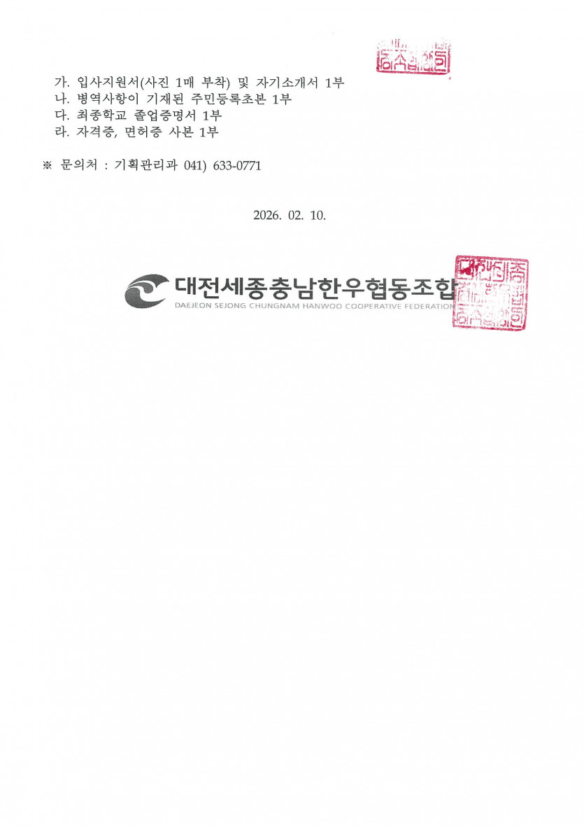 신규직원 채용공고 페이지 정보 작성자 최고관리자 댓글 0건 조회 24회 작성일 26-02-11 15:55 목록 본문 신규직원 채용 공고 첨부된 입사지원서로 작성바랍니다. 첨부파일 다음글3/4분기 운영공개 25.10.16 댓글 0 댓글목록 등록된 댓글이 없습니다.