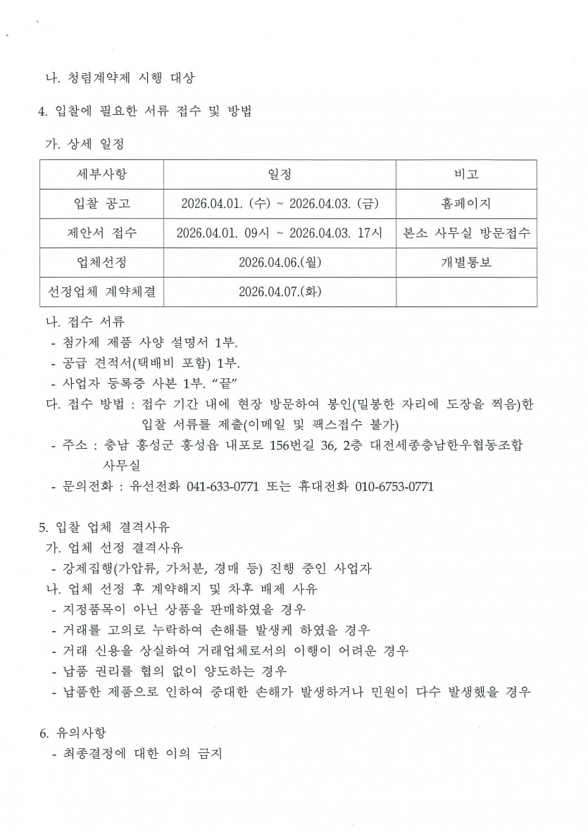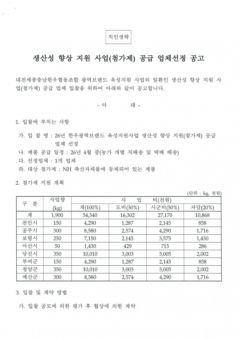 생산성 향상 지원 사업(첨가제) 공급 업체선정 공고 페이지 정보 작성자 최고관리자 댓글 0건 조회 123회 작성일 26-04-01 10:31 목록 본문 생산성 향상 지원 사업(첨가제) 공급 업체선정 공고 다음글신규직원 채용 연장 공고 26.03.06 댓글 0 댓글목록 등록된 댓글이 없습니다.